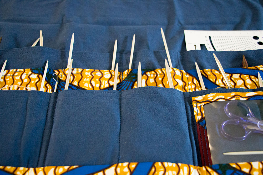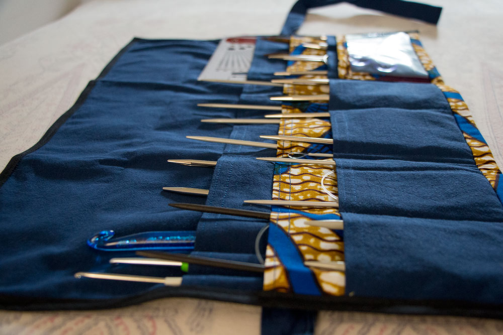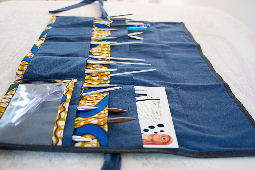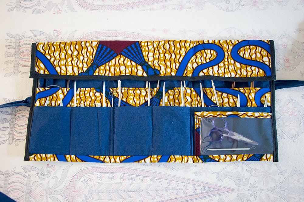15 pochettes pour aiguilles circulaires + 3 mini pochettes pour crochet ou autre + une pochette large + une pochette plastique transparente pour accessoires.
